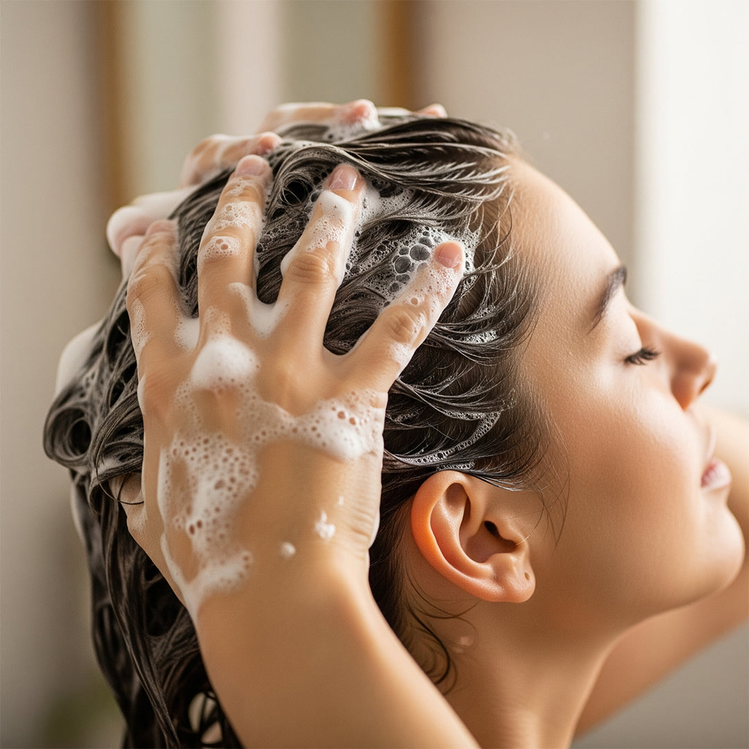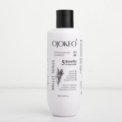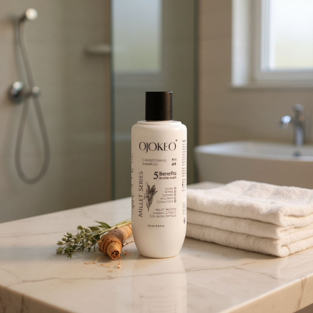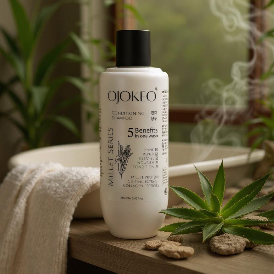 Start your transformation. Wet your hair thoroughly, then take a small amount of OJOKEO Millet 5-in-1 Shampoo. Gently massage it into your scalp and strands, letting the powerful blend of millet, ginseng, and collagen awaken your follicles. Feel the rich lather begin its work, preparing your hair for deep repair and nourishment.